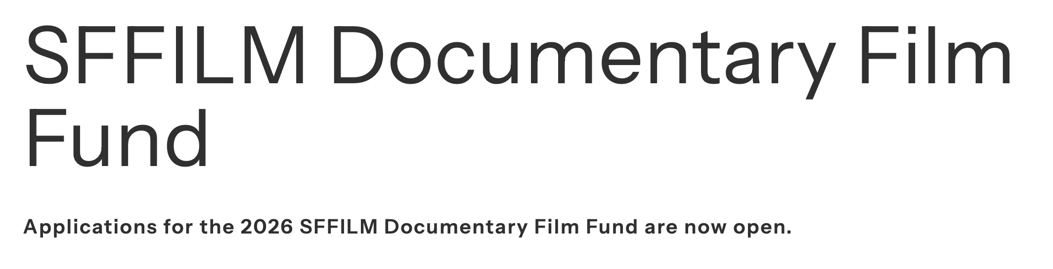 DFF grants are awarded once each year to documentary feature projects and are open to filmmakers internationally. The Documentary Film Fund grants its support to approximately 3–4 projects each year with grants of $10,000–$20,000. As with all SFFILM grants, in addition to the cash awards, recipients will gain access to numerous benefits through the comprehensive and dynamic SFFILM Makers artist development program.
